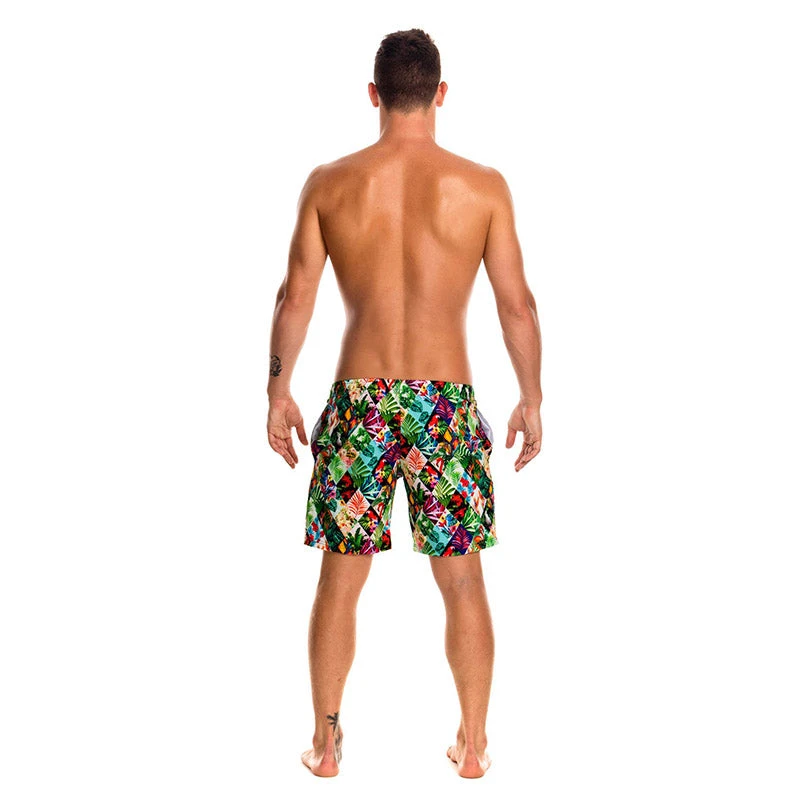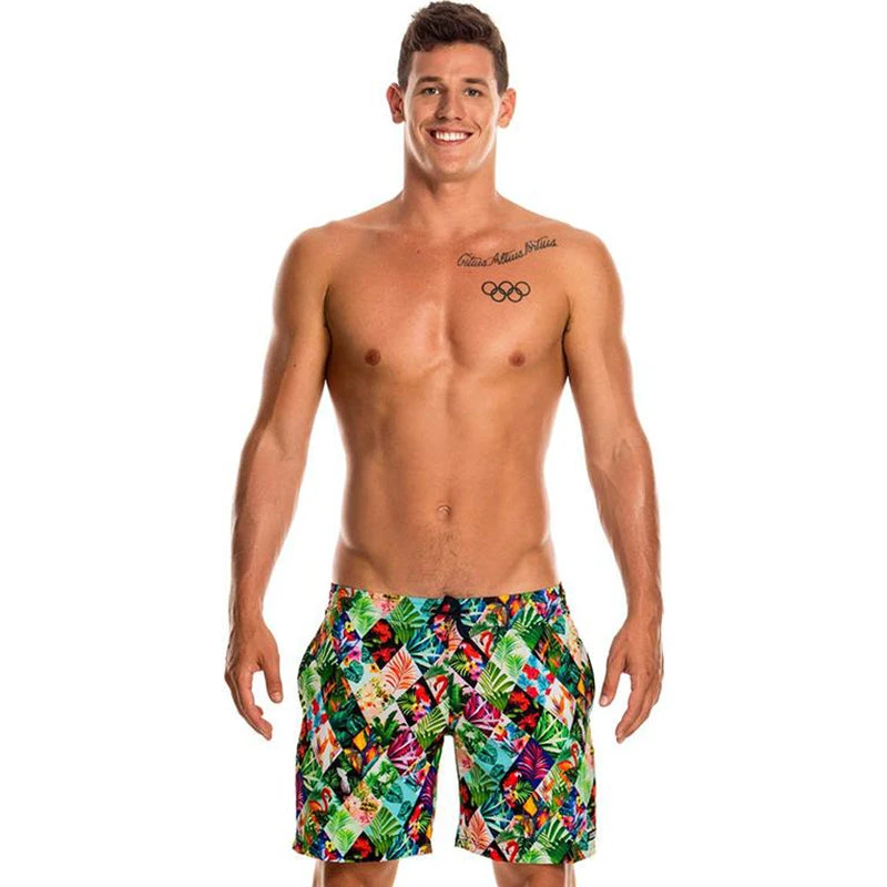 A stylish mid length fitted watershort for men made of quick drying polyester. Features deep side pockets, coin pocket and drawcord to fasten. Branded with brass hardware including metal tips, eyelets and rivets. Funky Trunks patch on leg. Available in sizes XS- XXL. 90% Polyester 10% Elastane